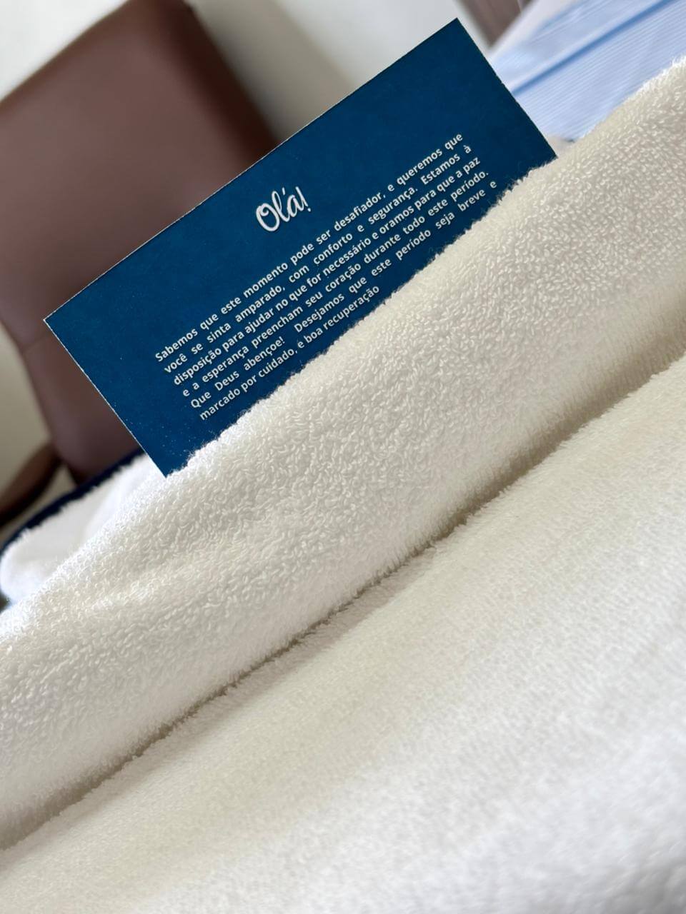 Como parte da ação, os pacientes também passam a receber um cartão de boas-vindas no momento da internação. O material traz uma mensagem de acolhimento e fé, com o objetivo de transmitir amparo, esperança e tranquilidade desde a chegada à unidade.